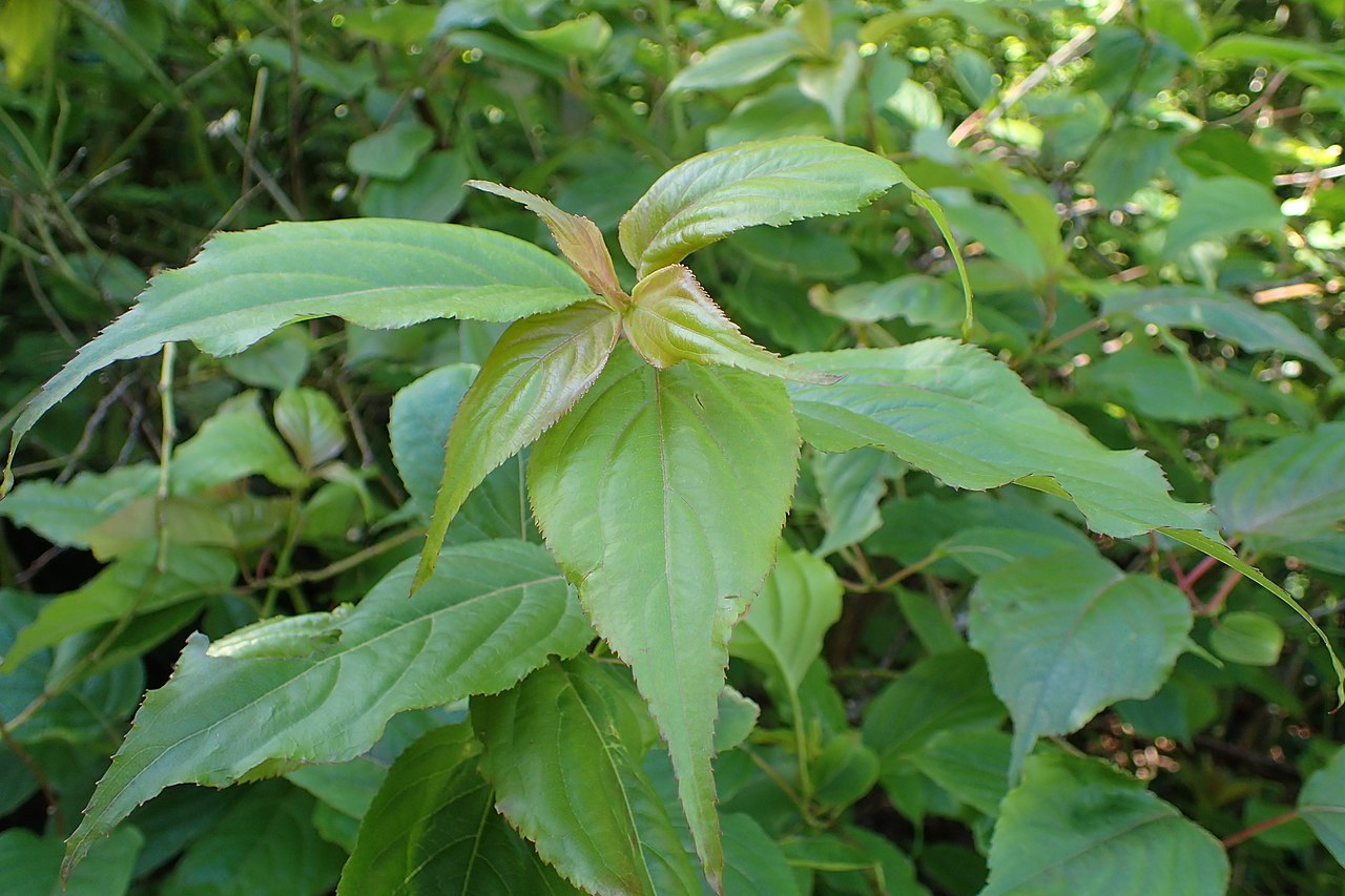 - 单叶互生,长椭圆形至卵状披针形,边缘有锯齿,叶片表面绿色而背面淡绿色