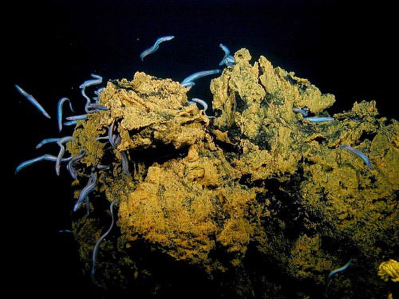 Source: Swarms of small synaphobranchid eels, Dysommina rugosa, live in the crevices on the summit of Nafanua.jpg