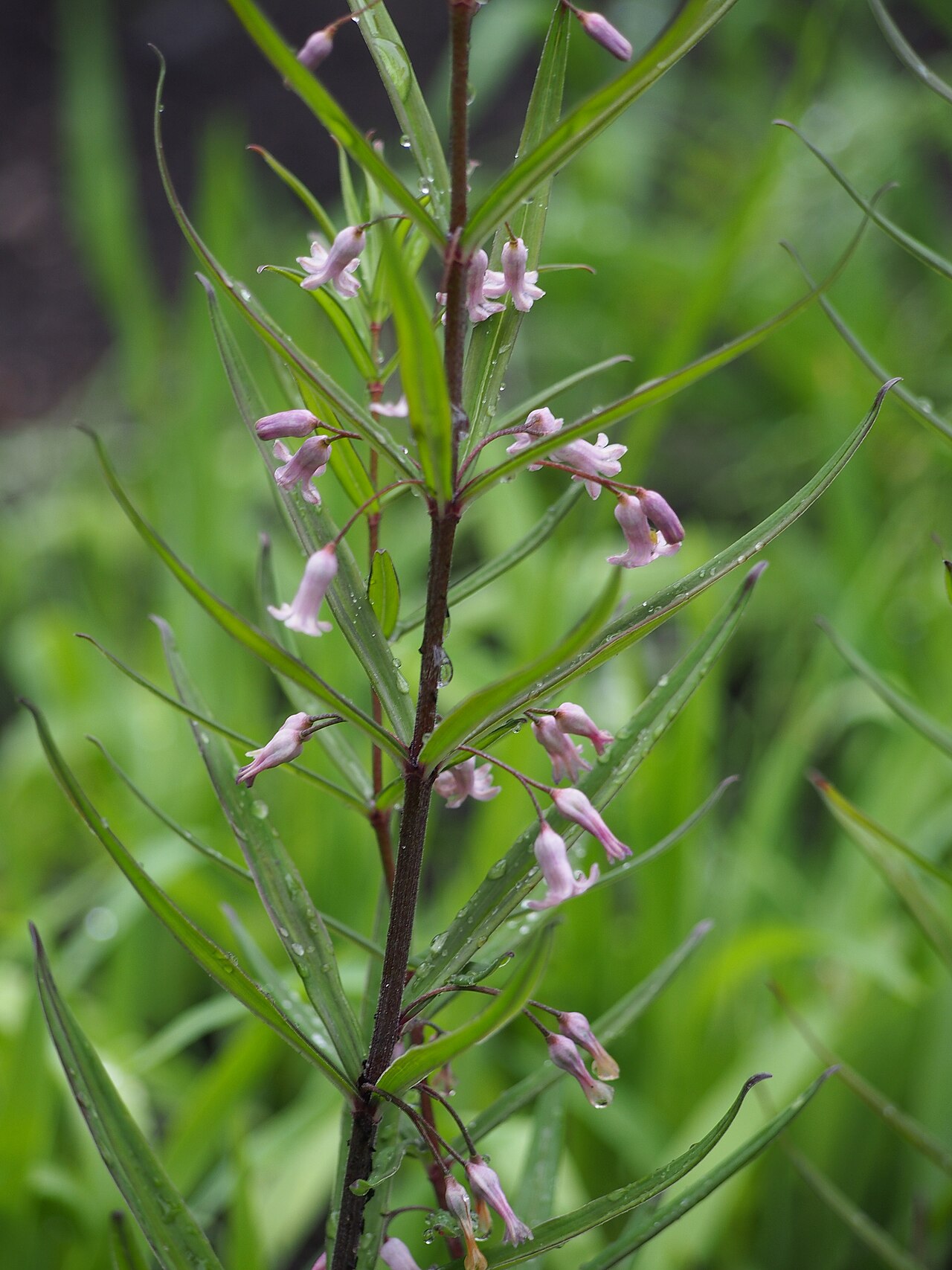 - 叶片披针形至线状披针形,长5-12厘米,宽0.5-1.5厘米,顶端渐尖,基部楔形,边缘全缘,下垂生长
