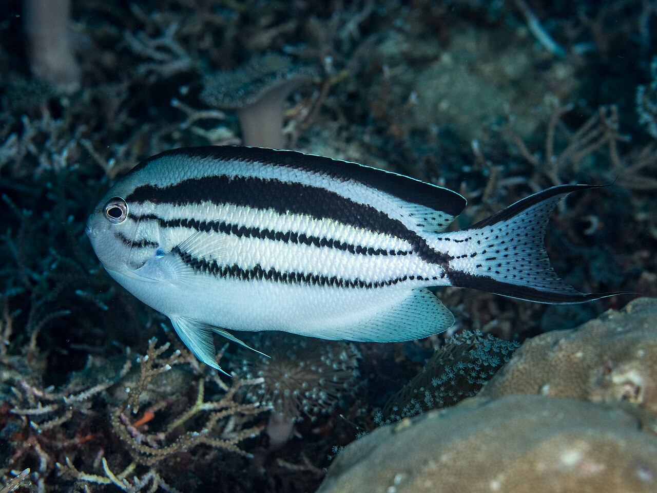 Source: Lamarck’s Angelfish female (Genicanthus lamarck) (32014570290).jpg