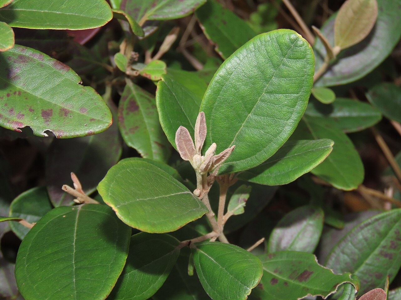 - 对生或轮生,革质,长椭圆形至披针形,边缘全缘,表面深绿色有光泽