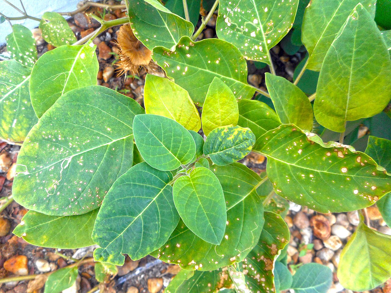 - 叶子为深绿色,呈心脏形或卵形,边缘有不规则锯齿