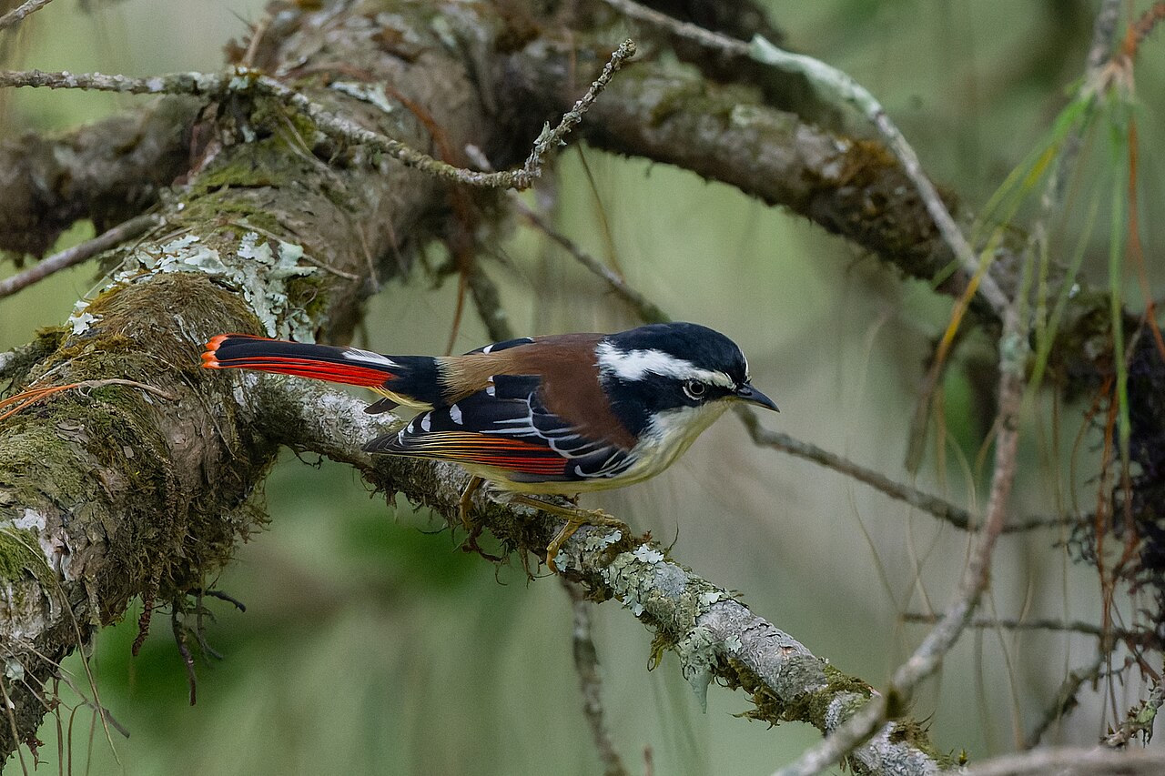 - 火尾希鹛拥有独特的橙红色尾羽,在树林间显得格外引人注目