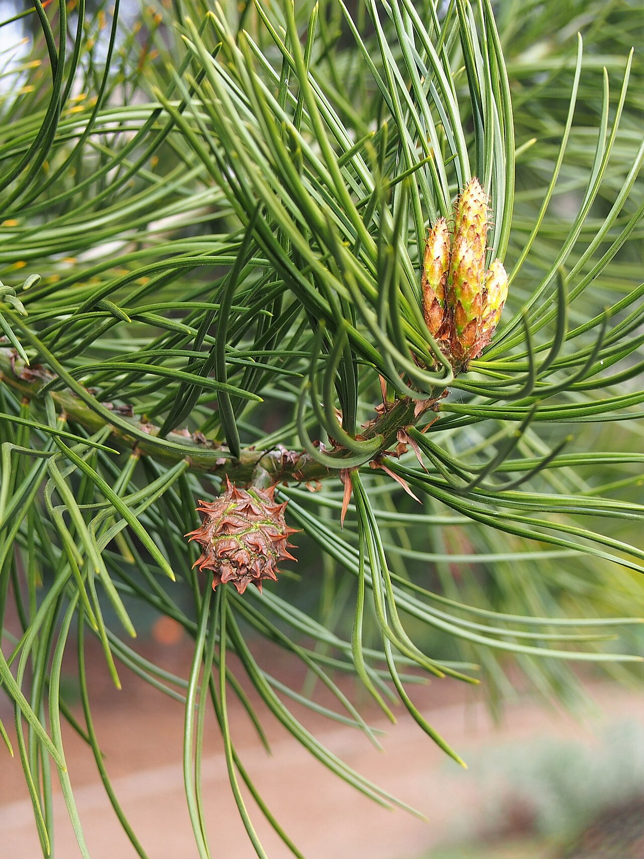 - 针叶三针一束,长5-10厘米,质地较硬,边缘有锯齿