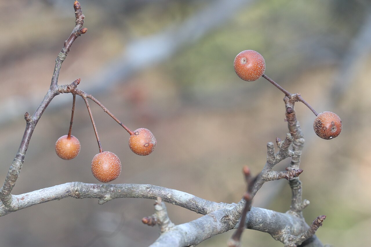 - 秋季成熟,小型梨果,直径约1-2厘米,初期绿色后转黄褐色,内含多颗种子