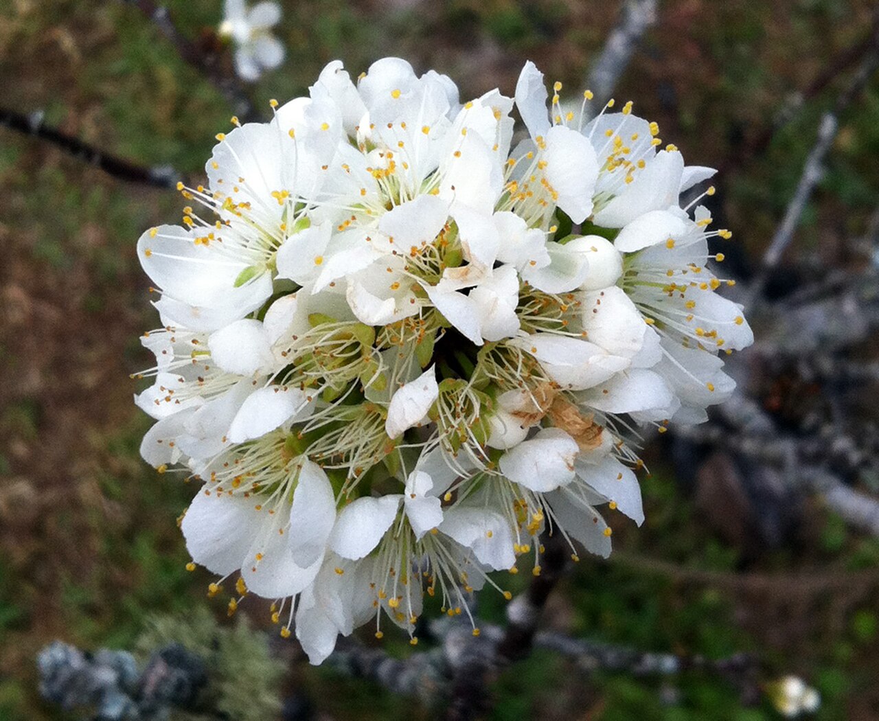 - 花单生或簇生于枝顶,花瓣五片,通常白色或浅粉色,具有芳香