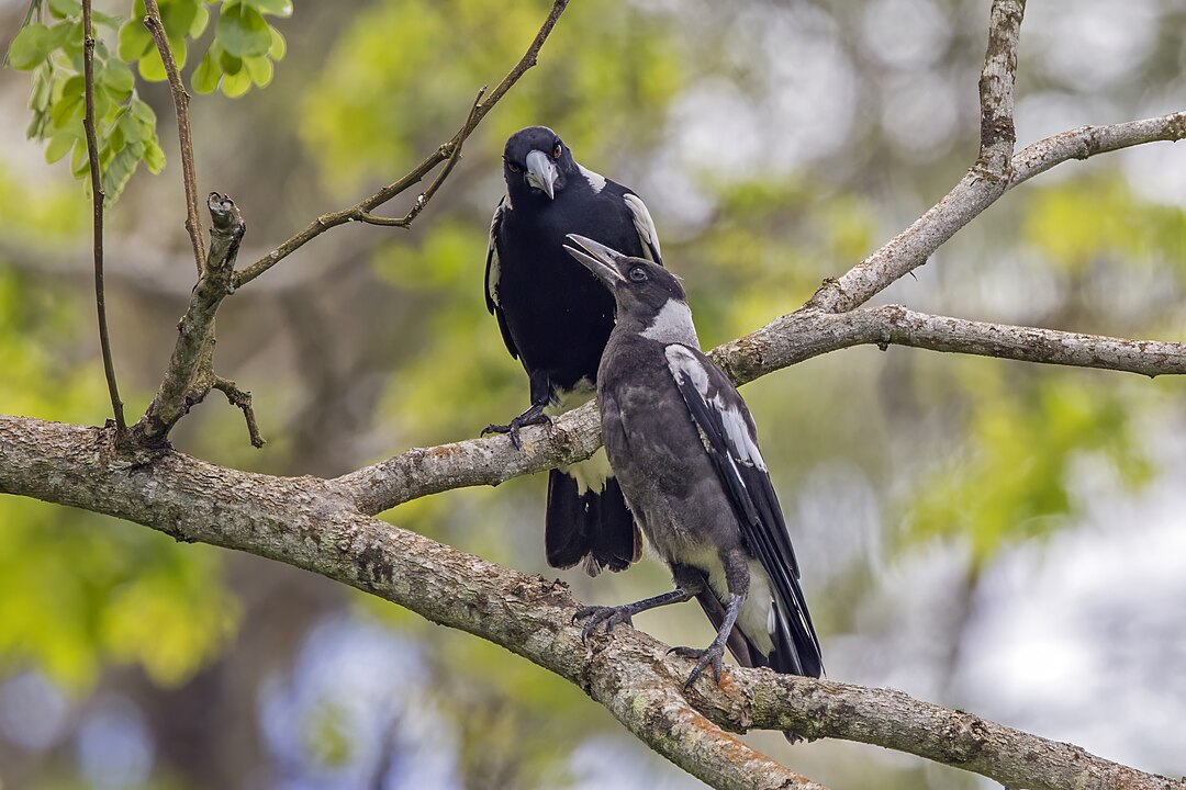 Source: Australian magpie (Gymnorhina tibicen) with juvenile Taveuni.jpg