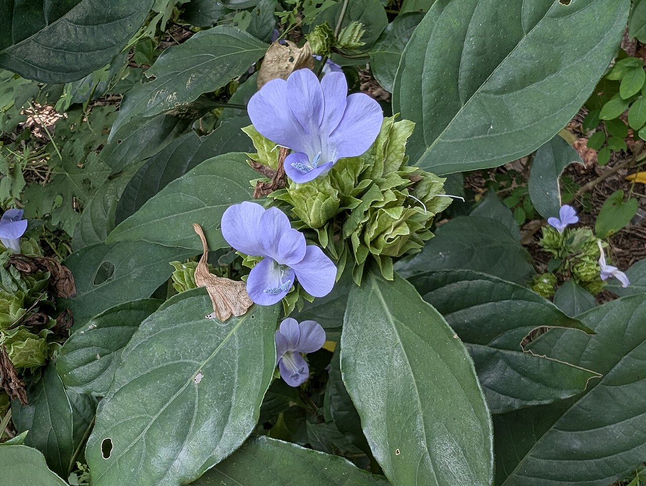 - 花单生于叶腋,花瓣5枚,颜色从紫色到蓝紫色不等,花径约2-3厘米
