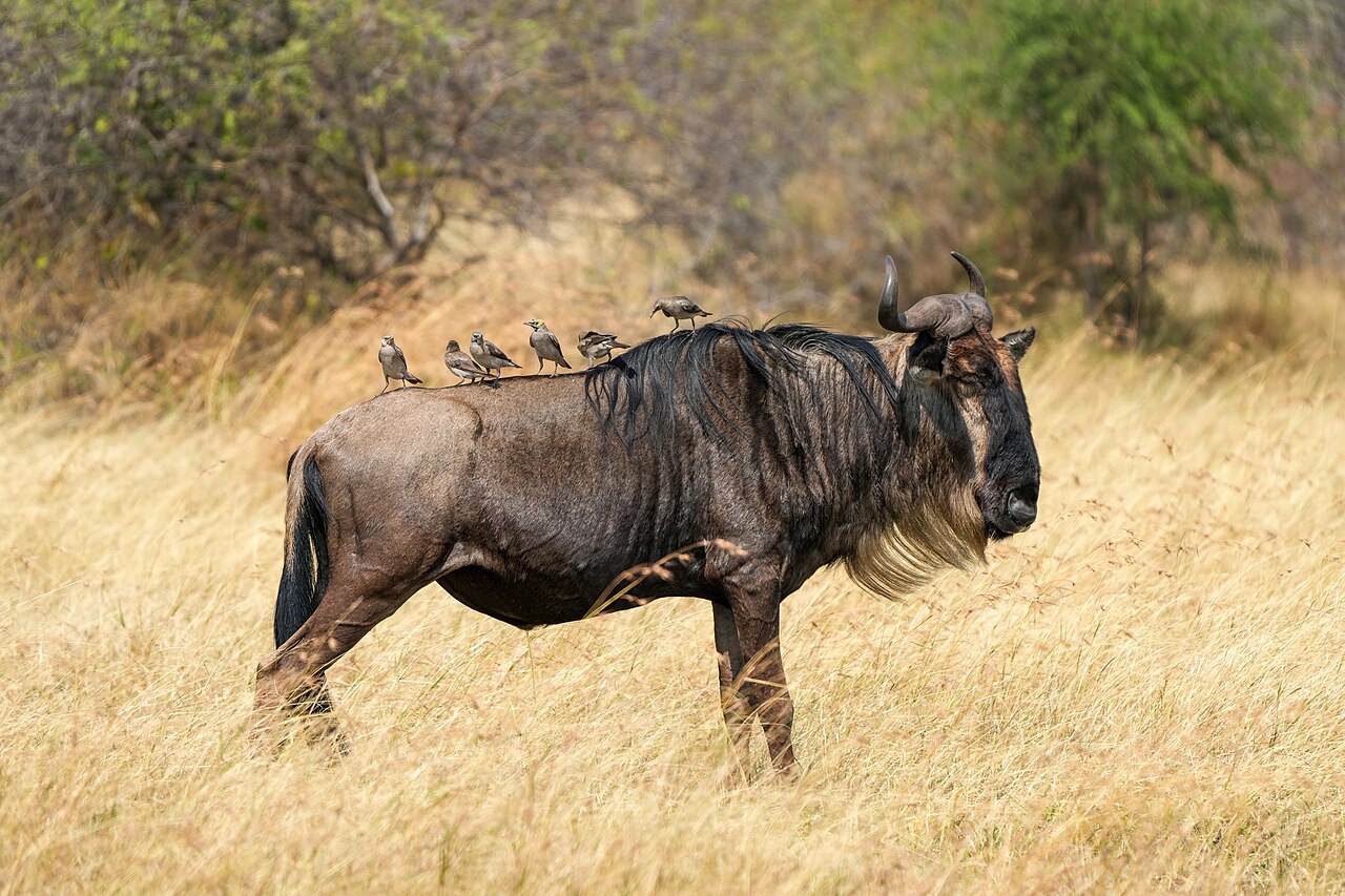 Source: 040 Blue wildebeest with wattled starlings in the Serengeti National Park Photo by Giles Laurent.jpg